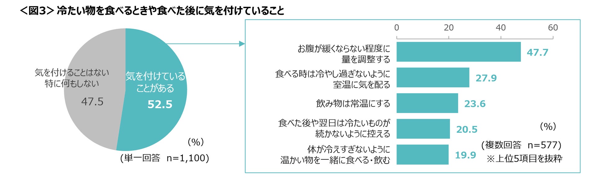 冷たい物を食べる時に気を付けていることがあると回答した人は約半数。そのうちの47.7%が「お腹が緩くならない程度に量を調整する」対策をしていた。<図3>