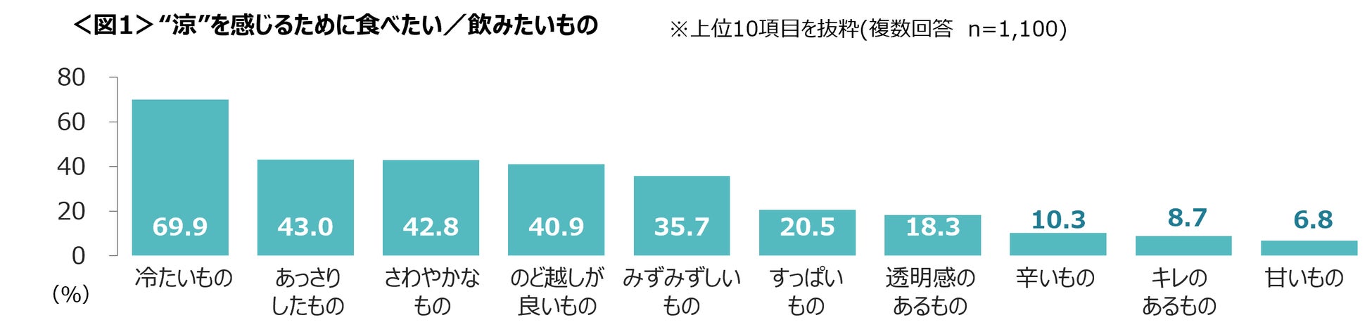 “涼”を感じるために食べたい、飲みたいものとしては「冷たいもの」が7割でTOP。<図1>