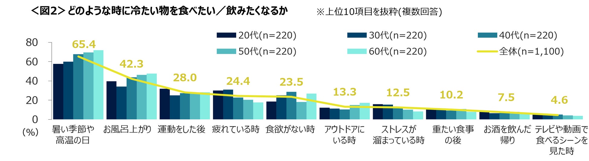 冷たい物を食べたくなる時は、「暑い季節や高温の日」や「お風呂上がり」「運動をした後」など体温の上昇が感じられる状態が上位にあがる 。<図2>