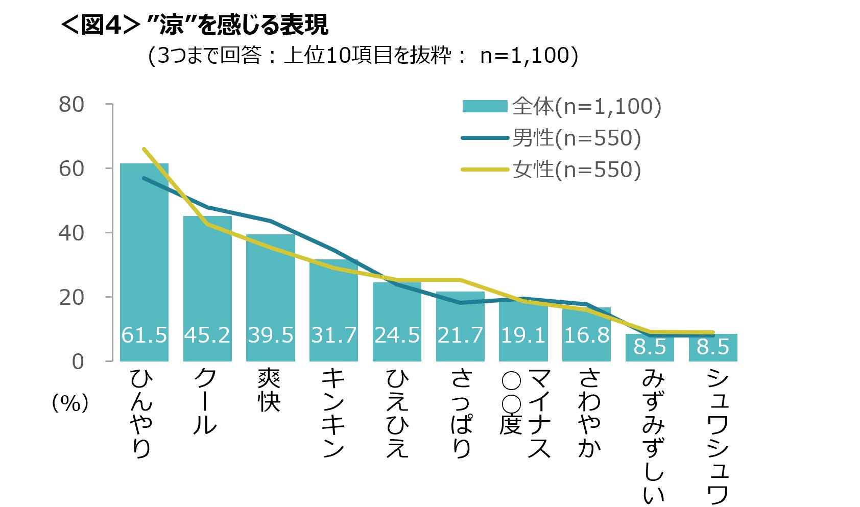 涼”を感じる表現は、「ひんやり」「クール」「爽快」がTOP3。<図4>