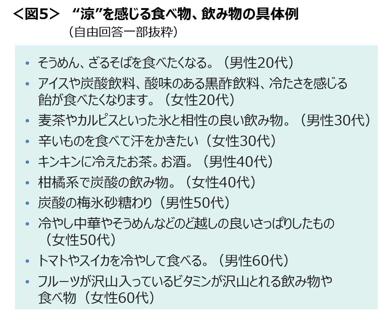 涼”を感じる具体的な食べ物・飲み物として、食べ物では「そうめん」「ざるそば」「冷やし中華」などの麺類が多くあがった。飲み物では「炭酸飲料」「冷たいお茶」などの声があがった。<図5>