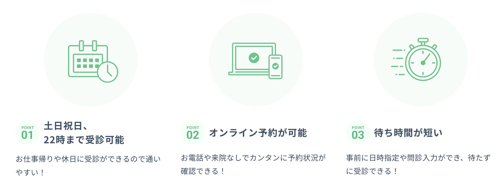 診察時間:平日・土日祝日 9:00-14:00 / 15:00-22:00