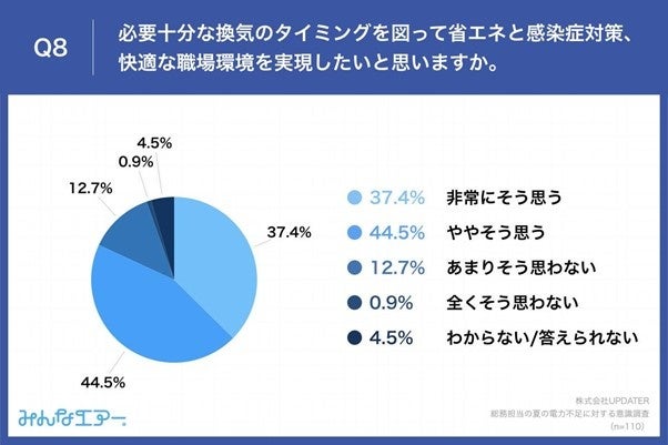 「Q8.必要十分な換気のタイミングを図って省エネと感染症対策、快適な職場環境を実現したいと思いますか。」(n=110)と質問したところ、「非常にそう思う」が37.4%、「ややそう思う」が44.5%という回答となりました。