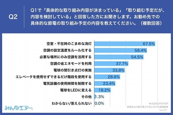 Q1で「具体的な取り組み内容が決まっている」「取り組む予定だが、内容を検討している」と回答した方に、「Q2.お勤め先での具体的な節電の取り組み予定の内容を教えてください。(複数回答)」(n=77)と質問したところ、「空室・不在時のこまめな消灯」が67.5%、「空調の設定温度をルール化する」が58.4%、「必要な場所にのみ空調を活用する」が54.5%という回答となりました。