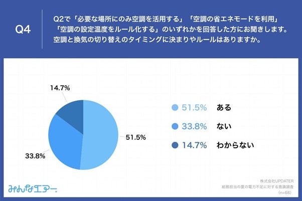 Q2で「必要な場所にのみ空調を活用する」「空調の省エネモードを利用」「空調の設定温度をルール化する」のいずれかを回答した方に、「Q4.空調と換気の切り替えのタイミングに決まりやルールはありますか。」(n=68)と質問したところ、「ある」が51.5%、「ない」が33.8%という回答となりました。