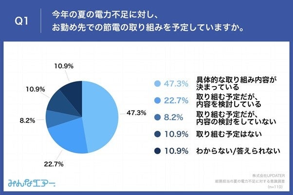 「Q1.今年の夏の電力不足に対し、お勤め先での節電の取り組みを予定していますか。」(n=110)と質問したところ、「具体的な取り組み内容が決まっている」が47.3%、「取り組む予定だが、内容を検討している」が22.7%という回答となりました。