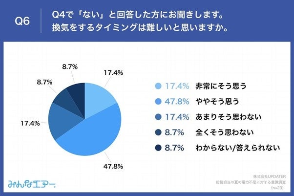 Q4で「ない」と回答した方に、「Q6.換気をするタイミングは難しいと思いますか。」(n=23)と質問したところ、「非常にそう思う」が17.4%、「ややそう思う」が47.8%という回答となりました。
