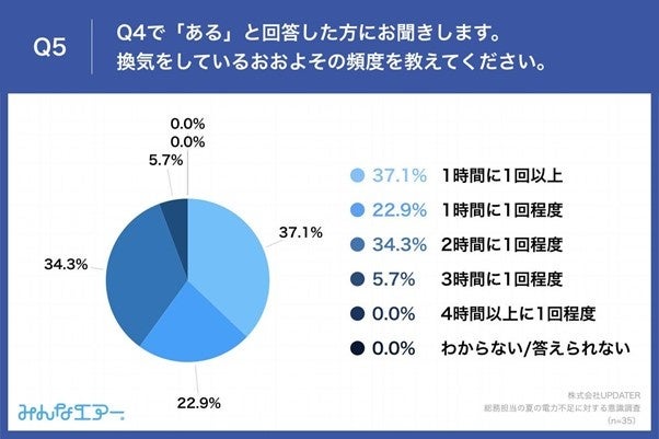 Q4で「ある」と回答した方に、「Q5.換気をしているおおよその頻度を教えてください。」(n=35)と質問したところ、「1時間に1回以上」が37.1%、「1時間に1回程度」が22.9%という回答となりました。