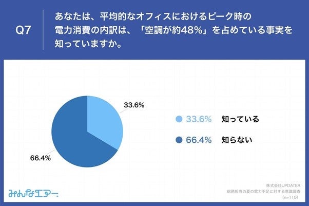 「Q7.あなたは、平均的なオフィスにおけるピーク時の電力消費の内訳は、「空調が約48%」を占めている事実を知っていますか。」(n=110)と質問したところ、「知っている」が33.6%、「知らない」が66.4%という回答となりました。