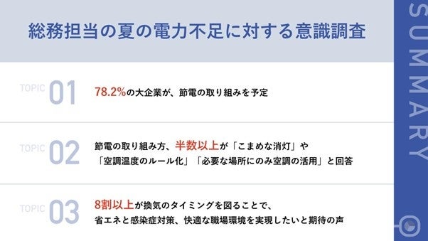 今年の日本の夏は深刻な電力不足が叫ばれており、日々ニュースで節電が呼びかけられています。なお、政府は電気料金の高騰対策として、節電をした家庭や企業を優遇する新たな制度を来週発表し(2022年7月21日予定)、家庭では節電でのポイント付与などが行われるようです。大企業においては電力の過剰使用に対する対策が毎年行われますが、熱中症や感染症対策としての懸念もあり空調の節電に関しては悩みを抱えやすいことが分かりました。また、夏の空調と換気のタイミングについて、特にルールを設けていない企業では、「換気をするタイミングは難しい」と考えられているようです。既に消灯や空調の設定など、電力の過剰使用対策をし尽くした総務担当者の悩みである「さらなる効果的な節電」への取り組みは、適切な換気のタイミングを図る方法を検討してみることかもしれません。