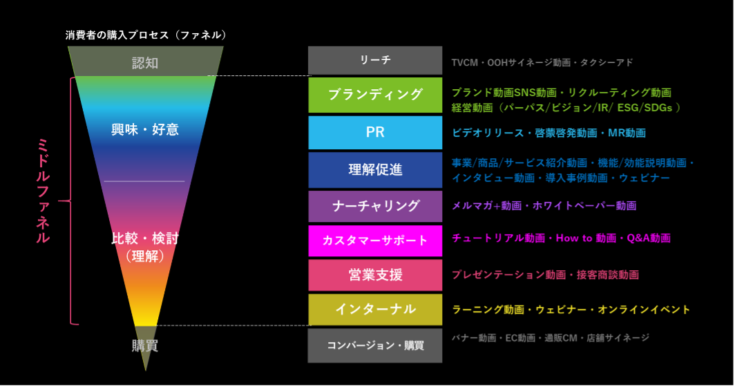 「ミドルファネル」とは、ブランディング、啓蒙啓発、効能理解、カスタマーサポートなど、多様な手法で生活者の「興味・好意」、「比較・検討」により理解を深め、購入への力強いパスとなる中間プロセスです。そのため、短尺動画よりも、1~3分の長尺動画が非常に効果的です。