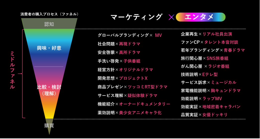 「経営計画×ヒューマンドラマ」、「理解促進×教育番組」、「啓蒙啓発×再現ドラマ」「品質実感×ドッキリ」…。多様な「マーケティング手法」と、映画・ドラマ・ドキュメンタリーなどの「映像エンタメ手法」との掛け算で動画化。「気づき」を喚起し、「知りたい」を促進し、長尺動画を飽きさせることなく「魅せ切り」、「買いたい」につなげます。