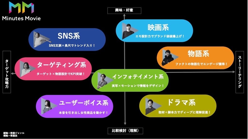 「Minutes Movie ™」は、このようなマーコム市場の新しいニーズに、卓越したストーリーテリングでお応えいたします。長尺動画のエキスパートである7名の映像ディレクターが、これまで培ってきた豊富な経験と、高い専門スキルを活用し、動画マーケティングに映画・ドキュメンタリー・ドラマなど映像エンタメ手法を掛け算し、高い視聴完了率とエンゲージメントを実現いたします。