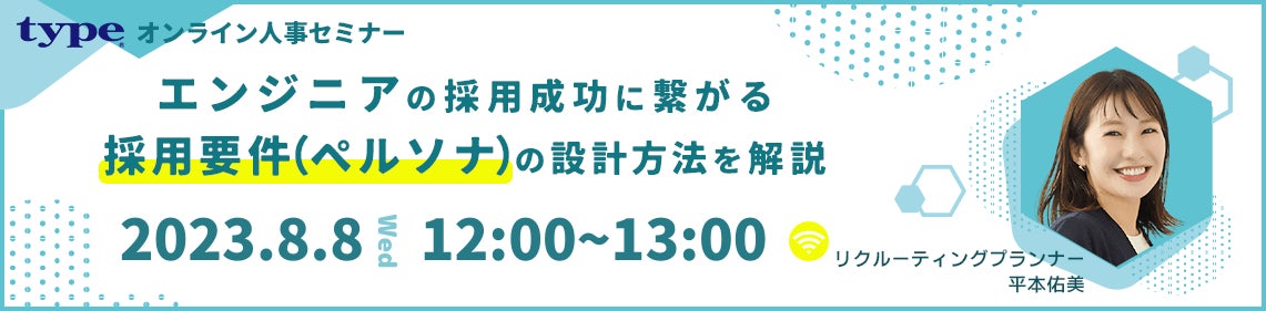 転職サイト「type」では、8/8(火)12時より「エンジニアの採用成功に繋がる採用要件(ペルソナ)の設計方法を解説」を開催いたします(https://info.type.jp/webinar-guide/20230808/)★セミナーエントリー特典として、ペルソナ設計にご活用いただけるお役立ち資料「【採用業務テンプレート】採用ペルソナ設計シート」をセミナー終了後にお送りさせていただきます