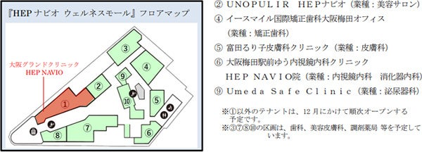 本リニューアルでは、従来の6階・7階レストランフロアのうち、6階を美容サロン・クリニックを中心としたフロアに刷新します。大阪・梅田にお買い物に訪れる方や観光に来られる方、近隣で働く方をターゲットとし、お客さまの美容と健康をナビゲートする『HEPナビオ ウェルネスモール』としてリニューアルします。なお、全10区画は順次にオープンし、全区画のグランドオープンは12月を予定しています。