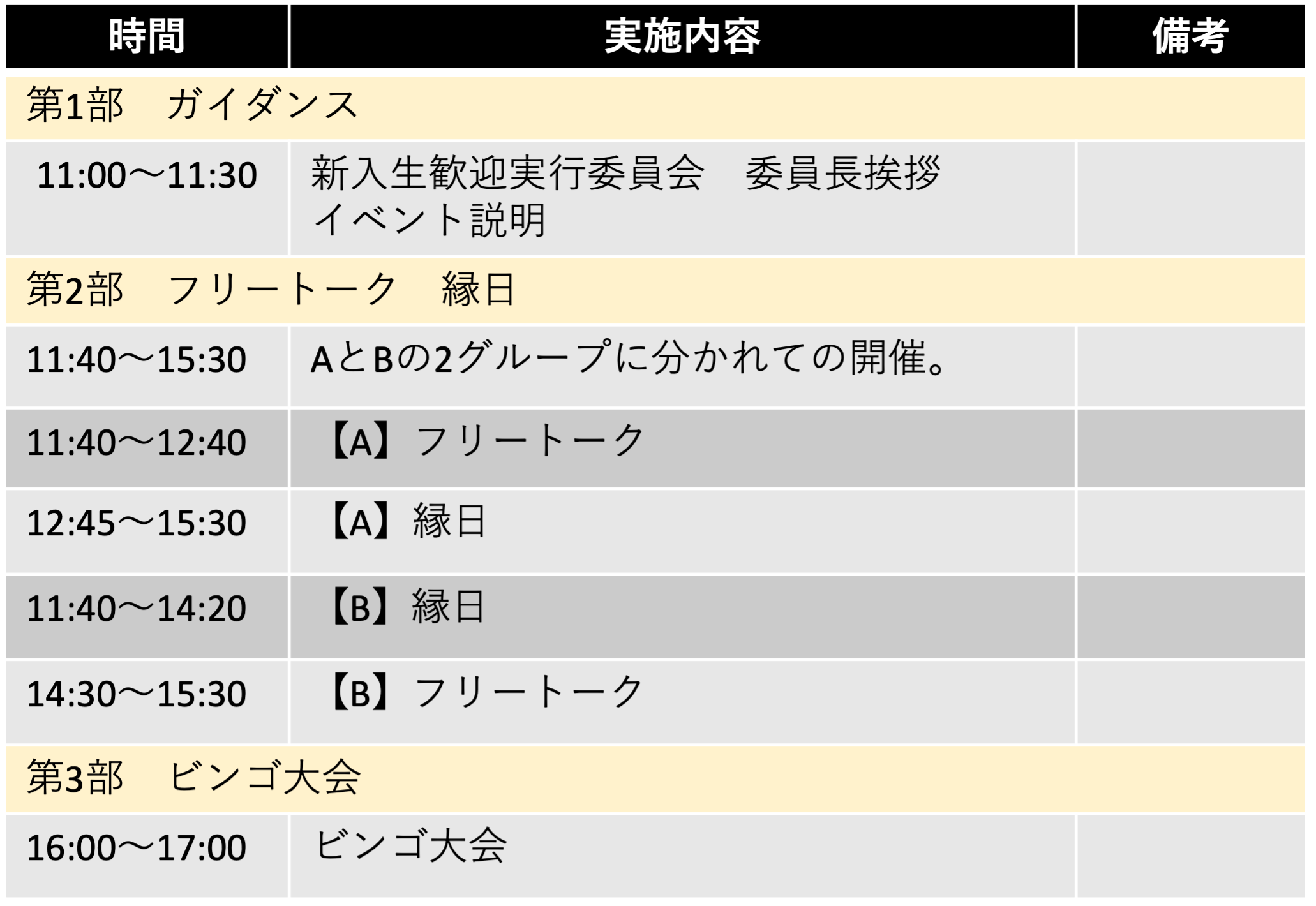 当イベントは、3 部制で行います。第 1 部では、イベント趣旨についてのガイダンスを行います。 第 2 部では、先輩学生との交流を通して大学生活の不安や悩み解消を行う「フリートークコーナー」と模擬店やゲームコーナーで参加者同士の交流を深める「縁日」を行います。第3部では、ビンゴ大会を行います。新入生が大学生として初めての夏休みを満喫してもらえるよう、夏に関連した 景品や、大学生活に役立つような景品をプレゼントする予定です。