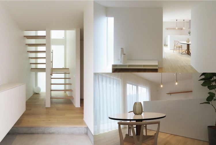 ・特徴:白を基調としたシンプルで飽きの来ない空間となっております。リビングの採光には2カ所のスリット窓を利用することでプライバシーを確保しております。