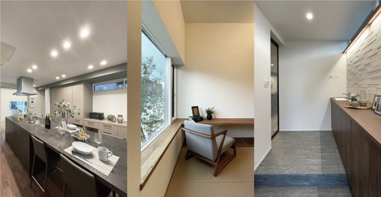 ・特徴:2階には書斎を設け、生活スタイルに合わせて家事コーナーや趣味室としてもご活用いただけます。全館空調を設置していることで24時間365日室温を一定に保つことができ、部屋ごとに温度差が生じないなどの快適性をご体感いただけます。また、電気錠、照明、エアコン、ガス給湯器がインターネットに繋がり、スマートフォンから遠隔操作できるIoTシステムも体験できます。