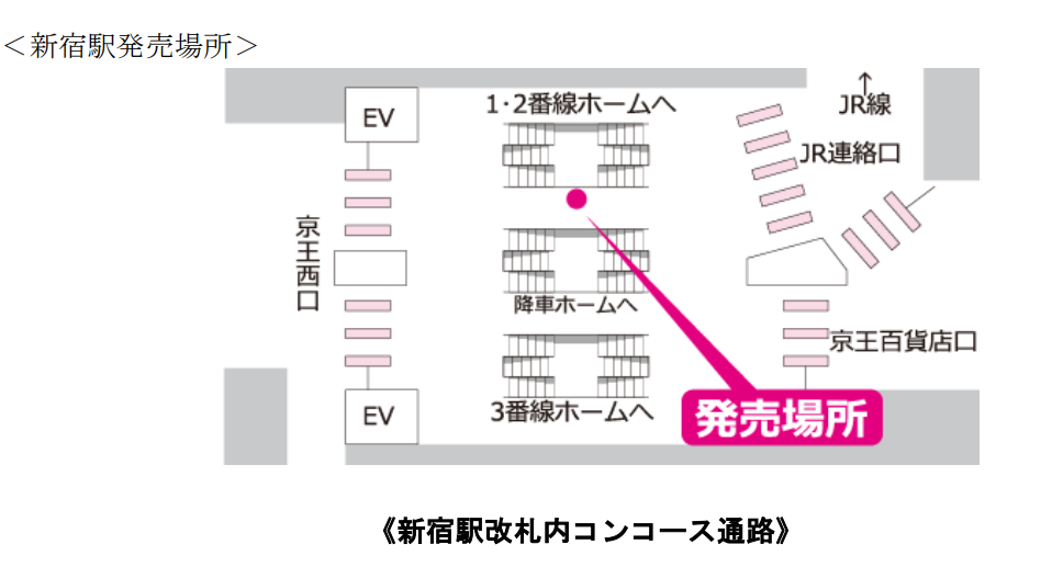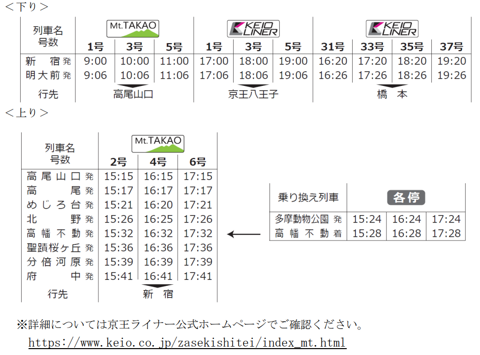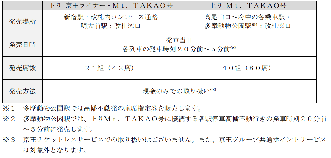 発売対象の列車は、16時台から19時台に運行する新宿発の下り「京王ライナー」および9時台から11時台に運行する新宿発の下り「Mt.TAKAO号」と、15時台から17時台に運行する高尾山口発の上り「Mt.TAKAO号」です。