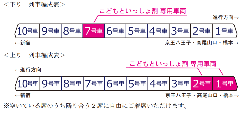 夏の行楽や都心方面でのお買い物帰りなどにおいて、お子さま連れのお客さまがお気軽に「京王ライナー」および「Mt.TAKAO号」をご利用いただけるよう、通常2席で820円(税込み)の座席指定料金がかかるところ、大人・小人の2席セット500円(税込み)で発売します。