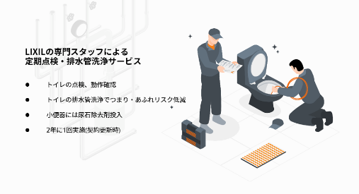 ベーシックプランに加え追加の定額料金をお支払いいただくことで、トイレに不具合があった際は、見積・発注フリーで何度でも追加費用なし※で、LIXILの修理工事等のメンテナンスサービスを受けられます。