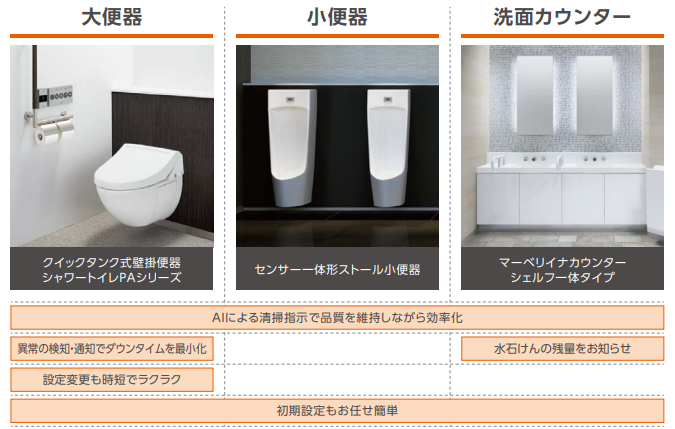 さらに今回発表された対応機種の追加により、大便器ブースのみならず、小便器や洗面の利用回数をカウントすることで、より効率的な清掃方法をご提案します。