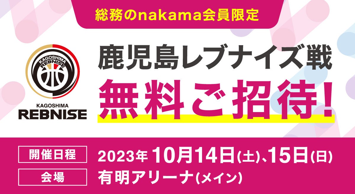 今回、東京で行われる鹿児島レブナイズのアウェイ戦に、「総務のnakama会員限定」で無料ご招待します。無料ご招待をきっかけに、鹿児島レブナイズを一緒に応援していただく仲間となっていただき、スポーツによる会員同士の交流活性化につなげたいと考えています。