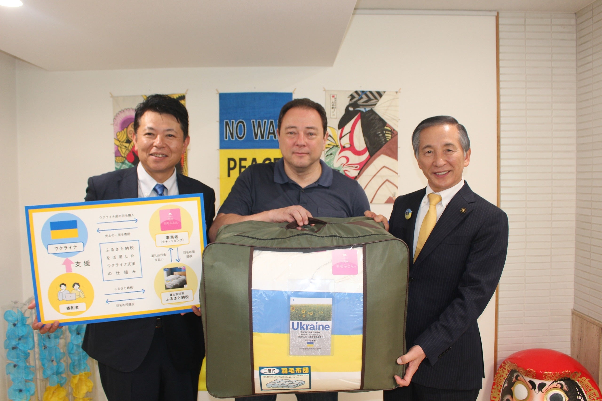 富士吉田市は、ウクライナからの避難民を受け入れた際、戦火を逃れ避難された方に、富士吉田市を拠点に構える寝具メーカー「タキ・リビング」と連携をし、人気の返礼品「甲州羽毛ふとん」をプレゼントしました。ウクライナは羽毛の産地であり、富士吉田市の基幹産業である羽毛布団を使っていただくことで故郷を感じながらも、日本での生活を安心して過ごしていただくことができ、大変喜んでいただきました。