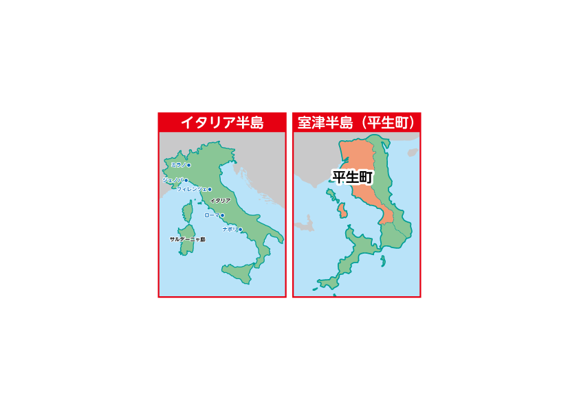平生町を含む室津半島の形や気候がイタリアに似ていることをヒントに「イタリアーノひらお」をキャッチフレーズとしてイタリアをテーマとしたまちづくりを進めています。