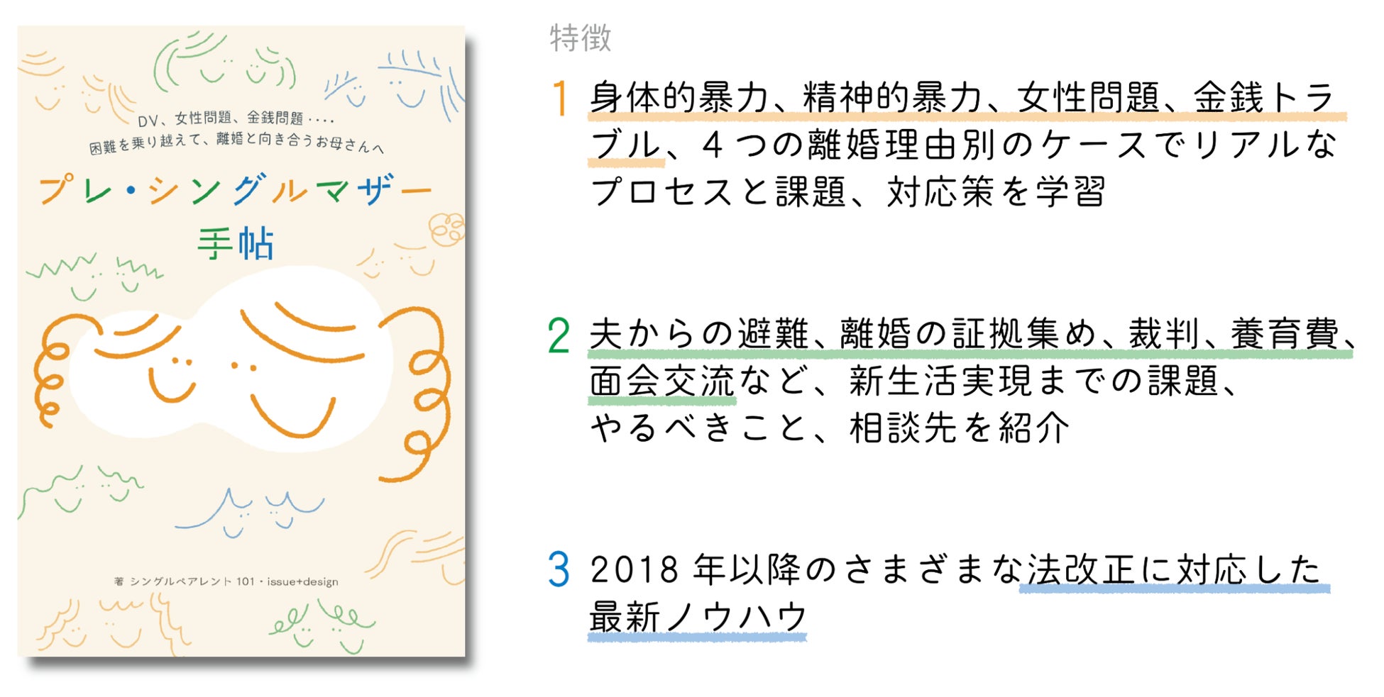 issue+design(特定非営利活動法人イシュープラスデザイン:東京都文京区)では、 DV、女性問題、金銭問題、困難を乗り越えて、離婚と向き合うお母さんのための書籍『プレ・シングルマザー手帳(issue+design books)』をMOTHERチャレンジの日(8/8)に発売いたします。本書は、「ひとり親でも安心して暮らせる社会の実現」をビジョンに対症療法と原因療法の二軸で社会変容に取り組む任意団体「シングルペアレント101」との共著として執筆しました。