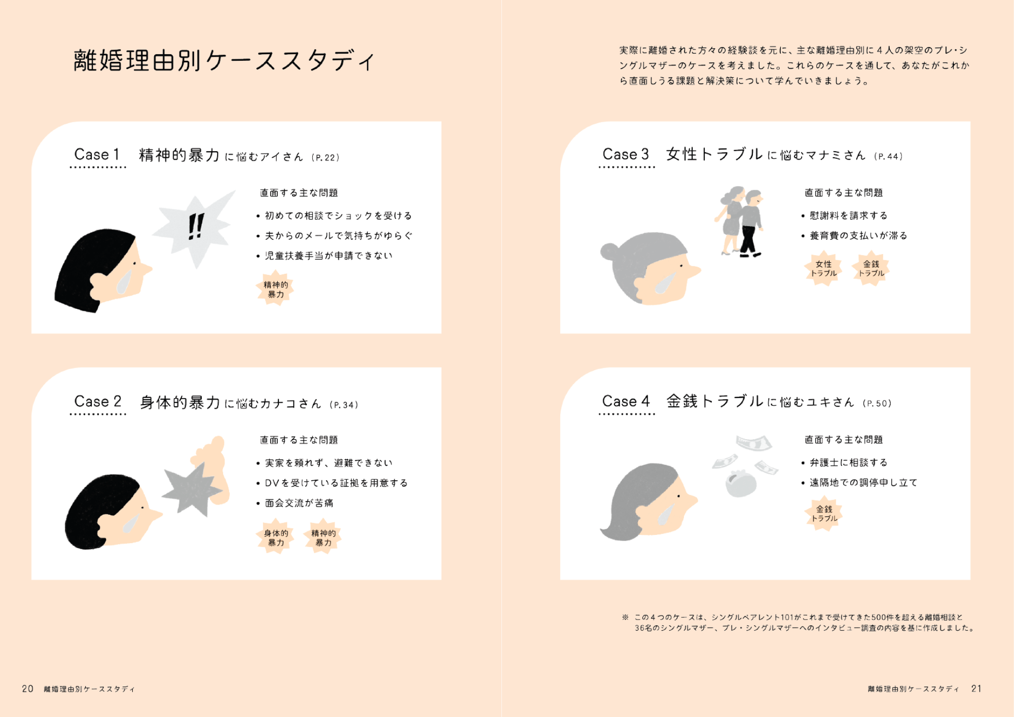 本書では、実際に離婚された方々の経験談を元に、 主な離婚理由別に4人の架空のプレ・シングルマザーのケースを考えました。 これらのケースを通して、あなたがこれから直面しうる課題と解決策について学んでいきましょう。