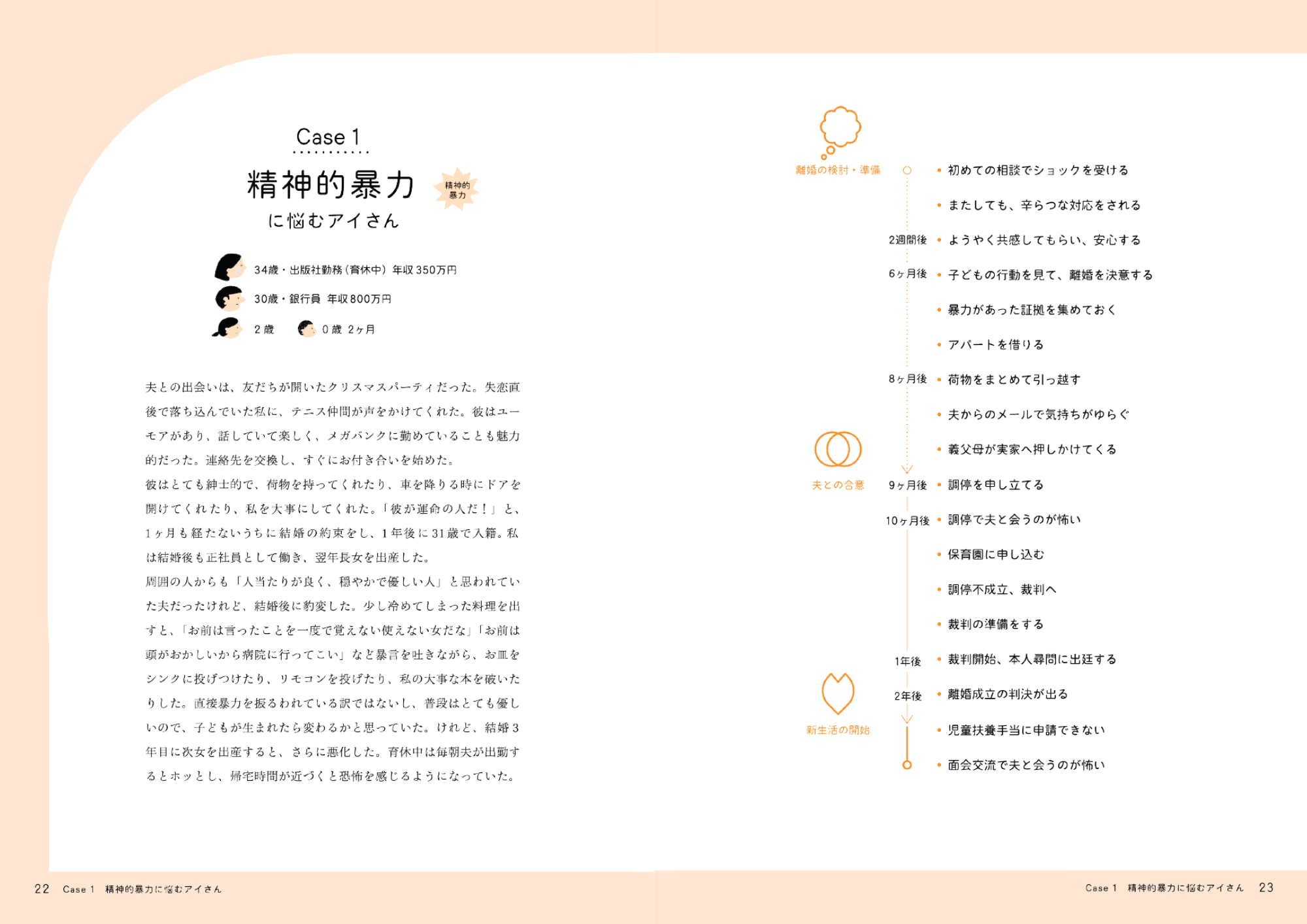 各ケーススタディーでは、離婚の検討から新生活の実現までに具体的にやるべきことや相談先を紹介しています。夫からの避難、離婚の証拠集め、裁判、親権、養育費、面会交流など、考えるべきポイントも網羅しています。