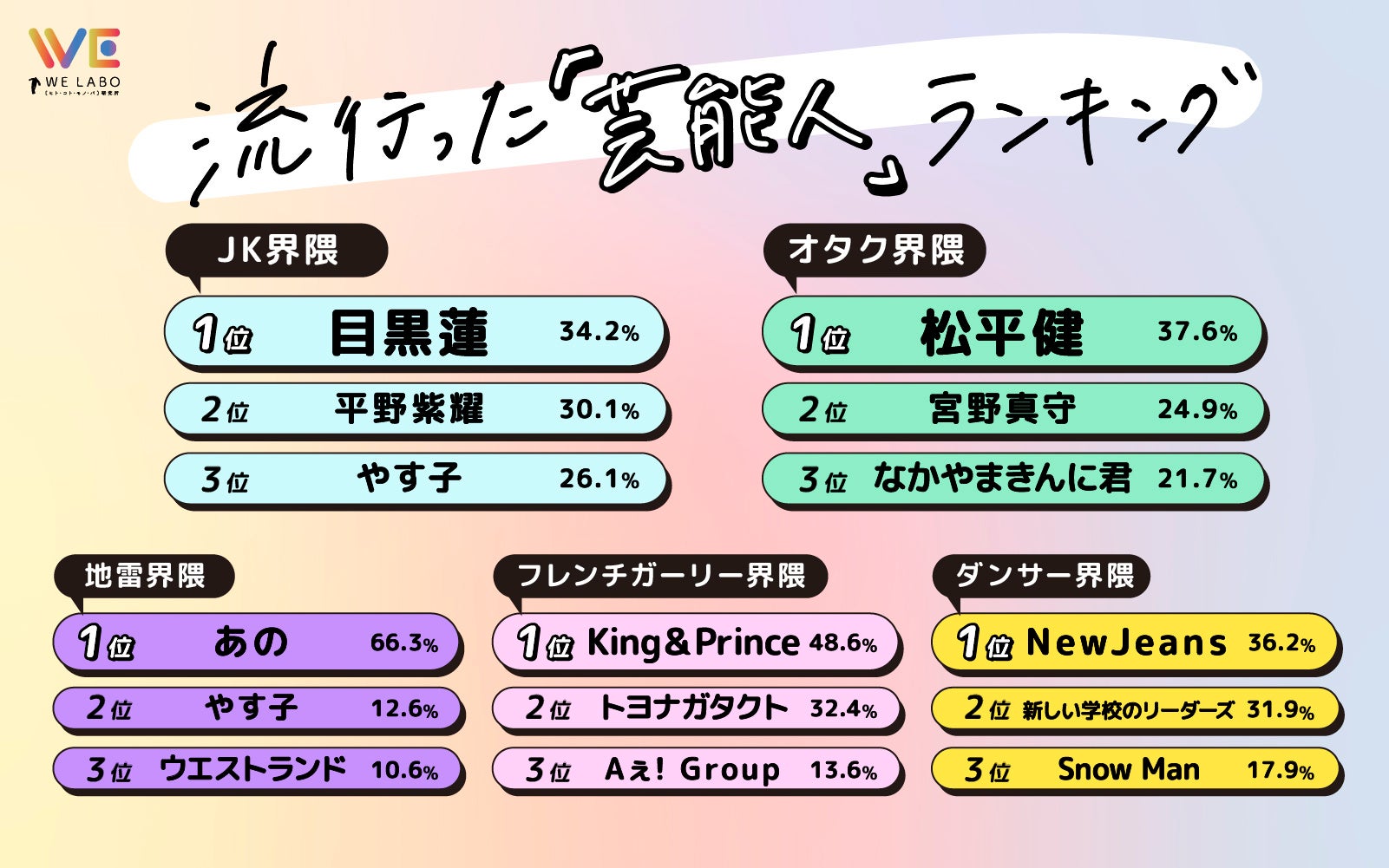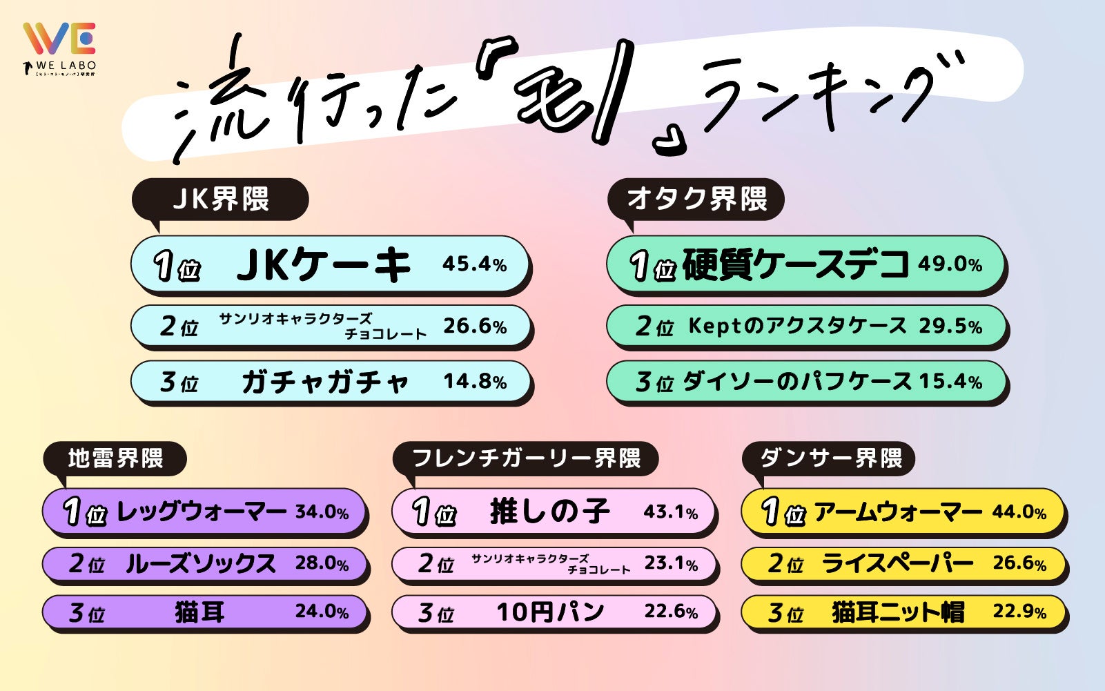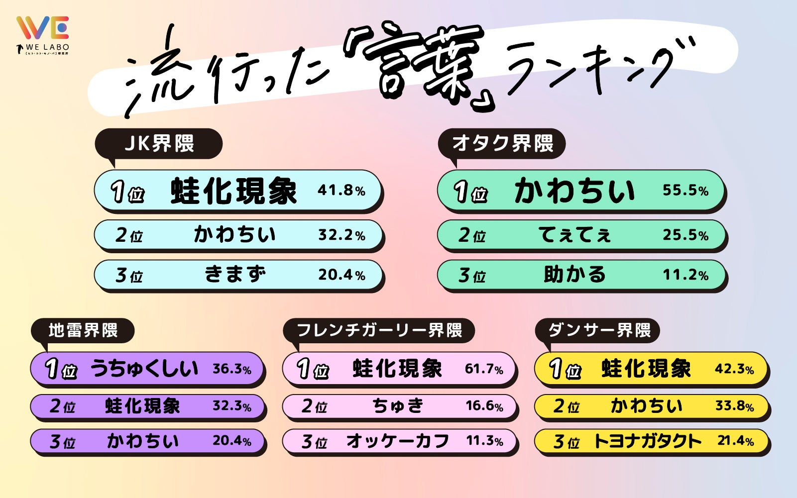 2023年上半期は、日本中のZ世代で「蛙化現象」や、派生ワードである「かわちい」などが大きなトレンドワードとなり話題となりましたが、言葉以外のモノ・コト・場所・芸能人・インフルエンサーにおいては、界隈別に結果がかなり分かれており、その界隈民にしかわからないワードやトレンドにはそれぞれの背景があり、非常に興味深いランキングとなっています。