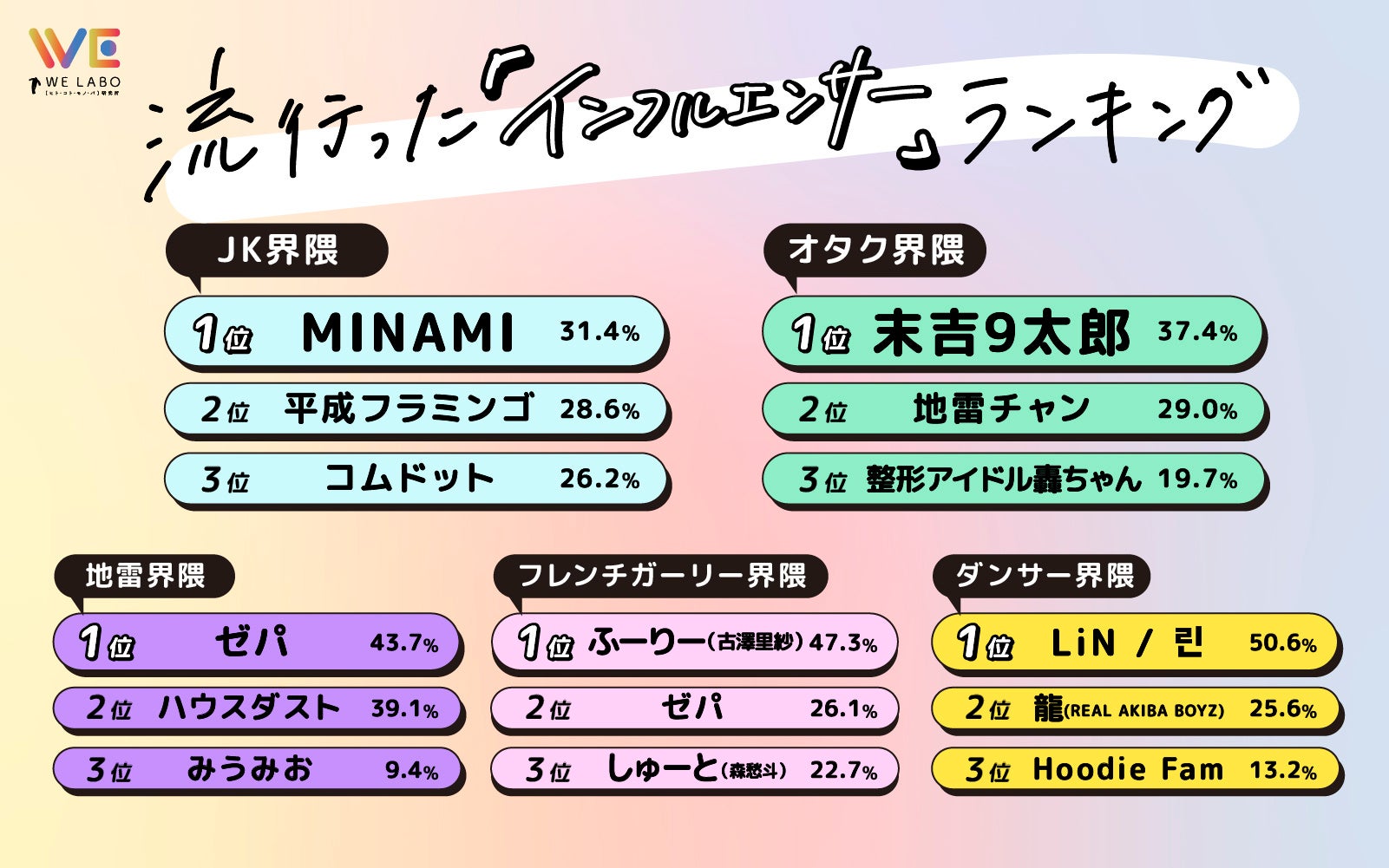 特に結果が分かれたのが「インフルエンサー」に関するランキング。それぞれの界隈をけん引する神様とも呼べるインフルエンサーたちがこぞってランクインしました。コンテンツが無限に多様化するSNS戦国時代では、万人受けを狙うよりも“界隈受け”が重要なキーワードになっているようです。