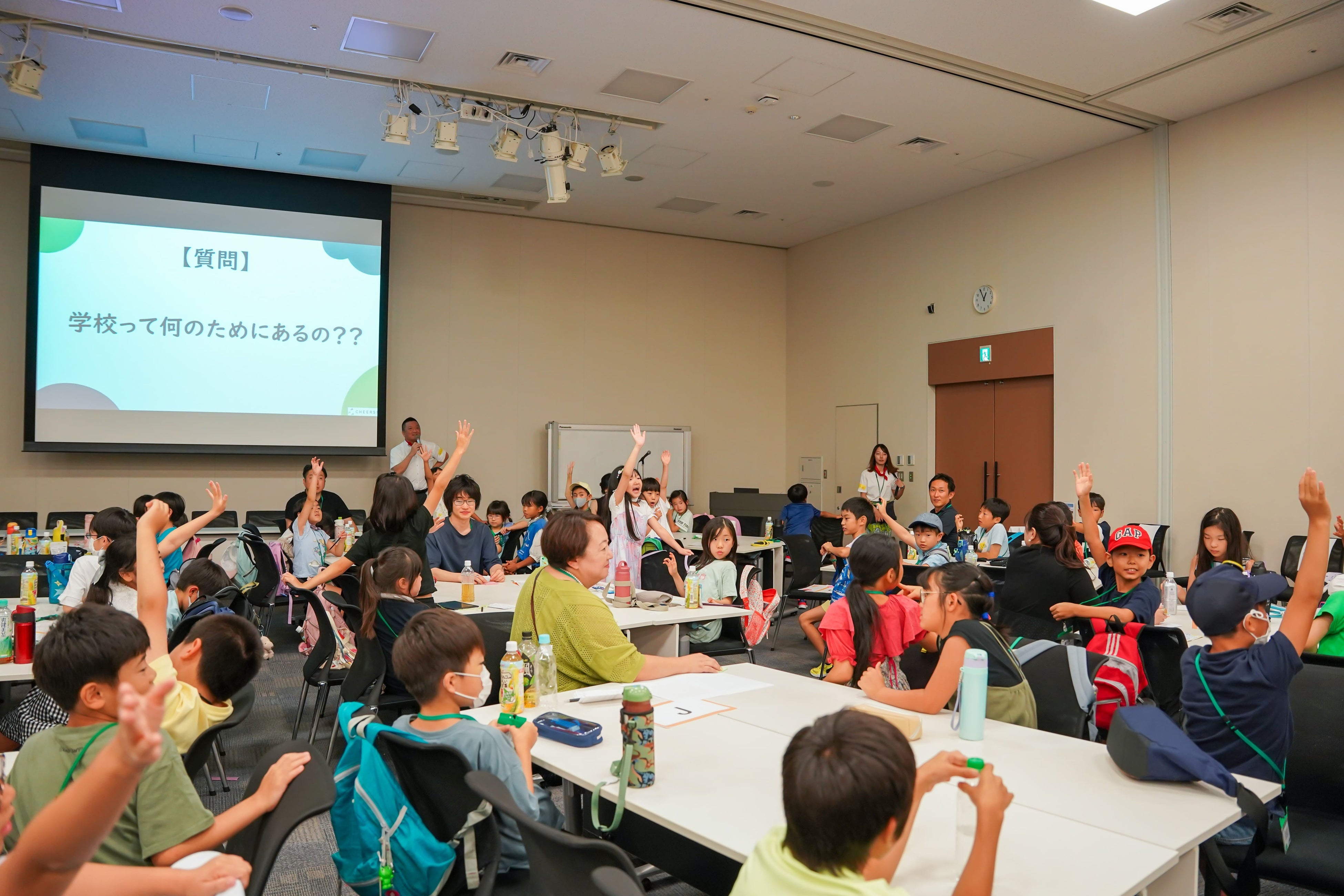 「学校って何のためにあるの??」という問いかけには、たくさんの挙手。