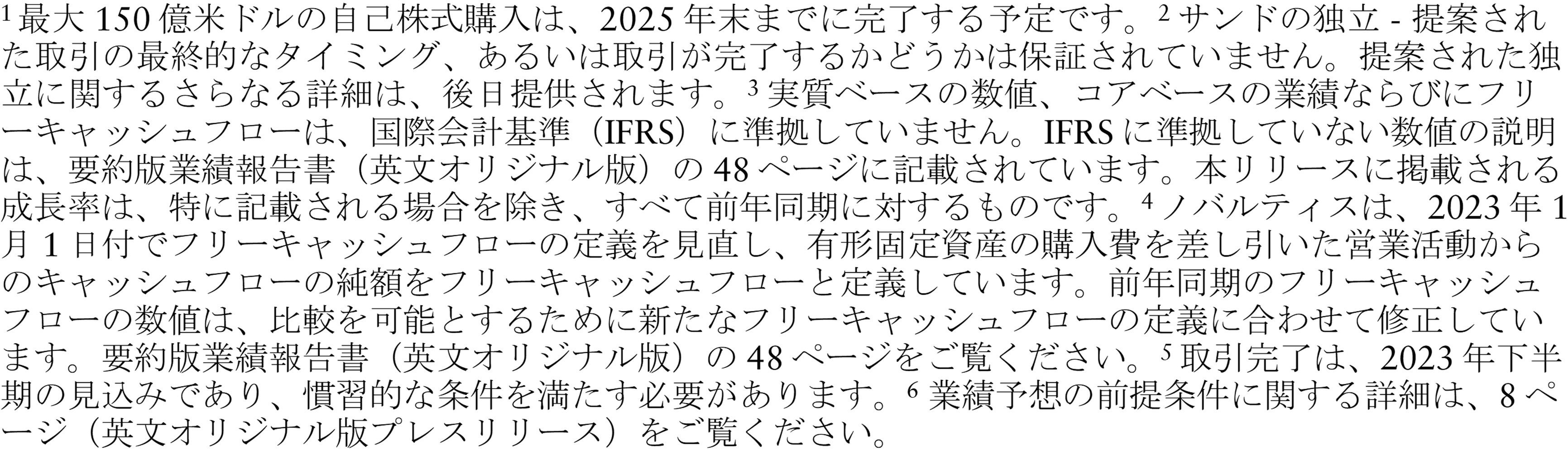 2023年7月中旬の為替レートが2023年の残りの期間も継続すると仮定した場合、2023年通期での為替の影響は、売上高に対して0からマイナス1ポイント、コア営業利益に対してマイナス5ポイントとなると予想しています。業績への為替影響の予想は、ノバルティスのウェブサイトで毎月提供されています。