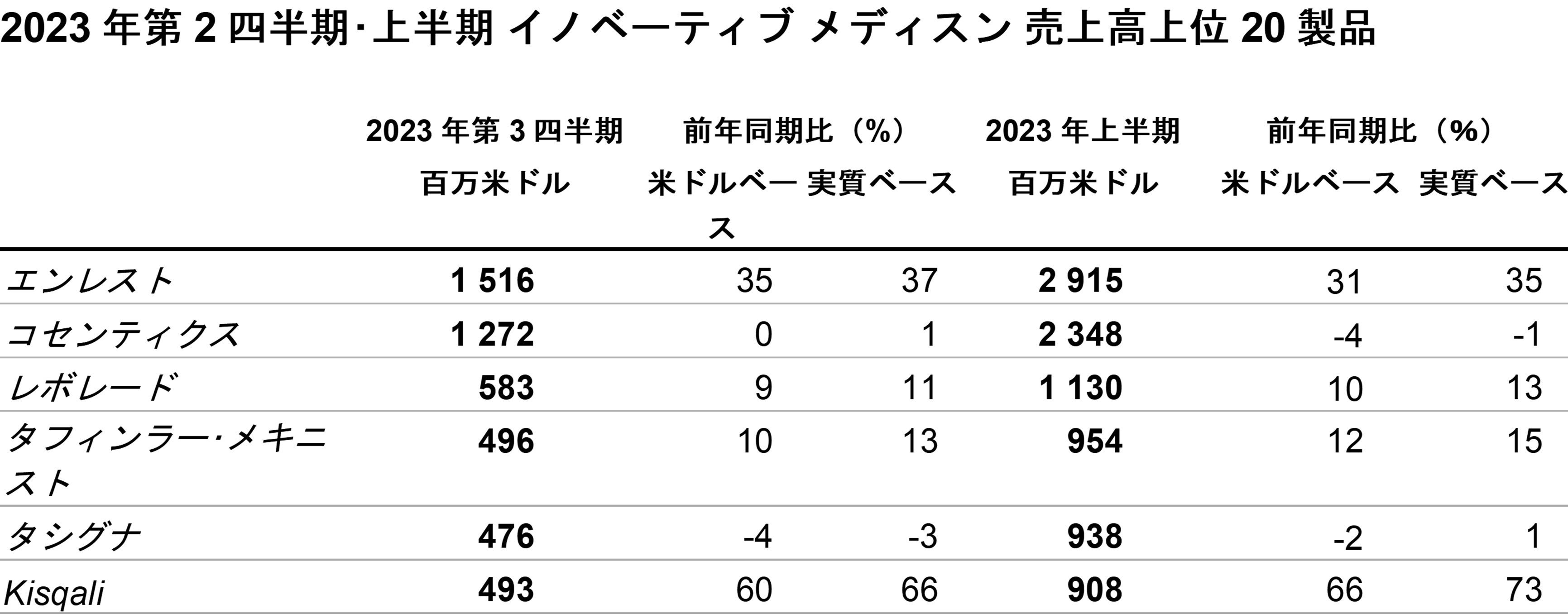 2023年上半期の売上高は、販売量の15ポイントの伸びが、価格低下による3ポイントならびにジェネリック医薬品との競合による4ポイントのマイナス影響により一部相殺され、266億米ドル(5%増、実質ベース 8%増)となりました。