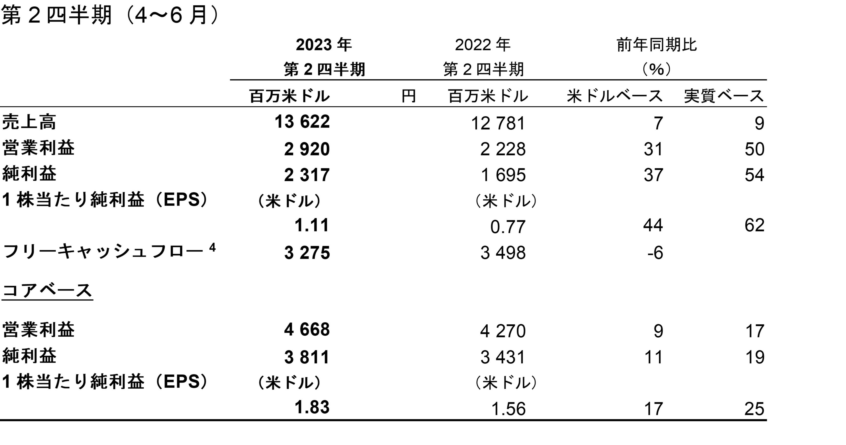 ■2023年第2四半期の営業利益は50%増(実質ベース、米ドルベース 31%増)となり、主に売上高の増加と事業再編費の減少が貢献。純利益は54%増(実質ベース、米ドルベース 37%増)となり、主に営業利益の拡大が寄与。フリーキャッシュフロー4)は、33億米ドル(米ドルベース 6%減)·