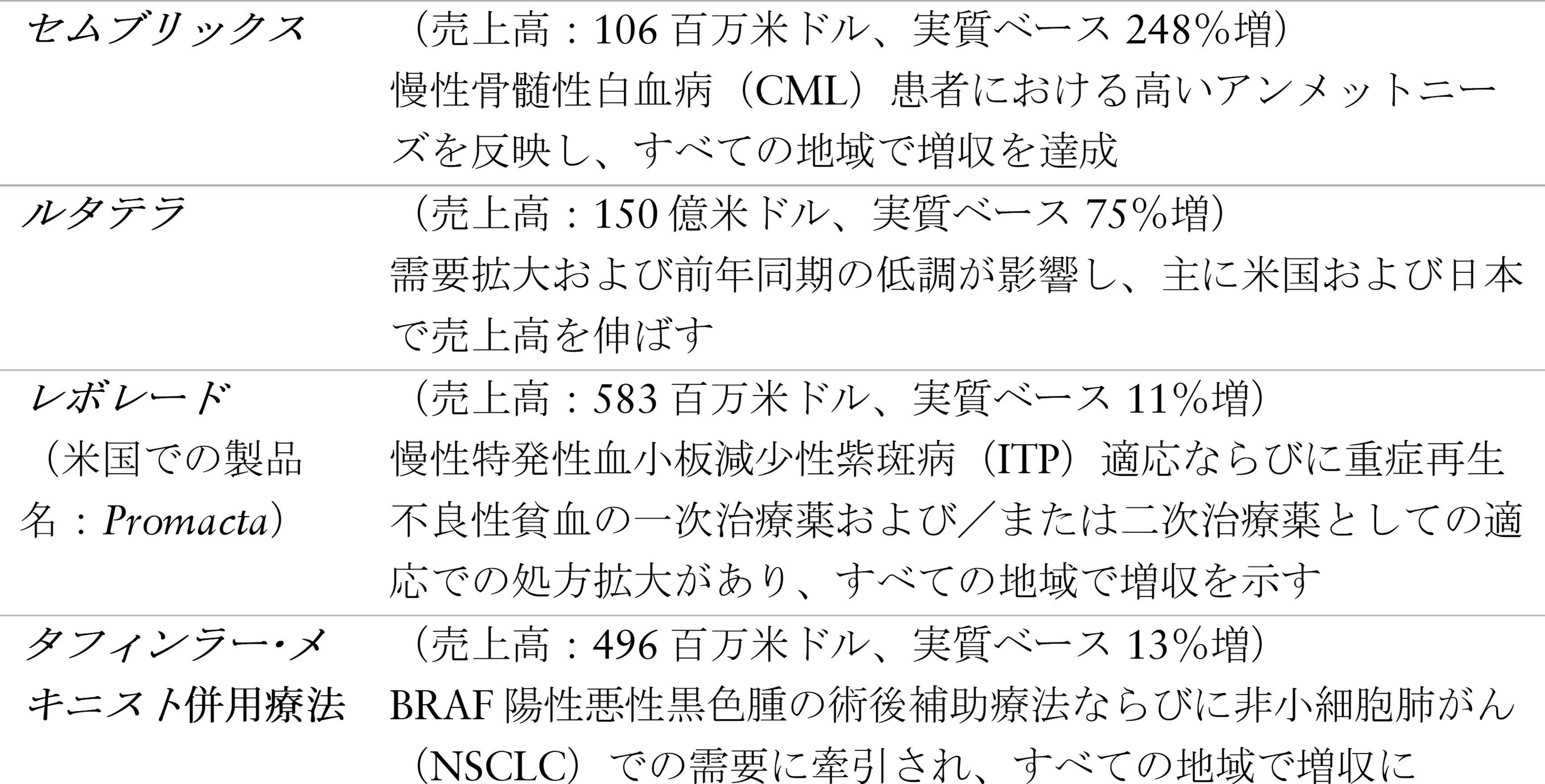 サンドの売上高は、販売量増加による9ポイントの貢献があり、24億米ドル(5%増、実質ベース 8%増)となりました。価格によるマイナス影響は、1ポイントでした。売上高の伸びは、前年の製品上市に伴う販売量の大幅な伸び、咳・風邪の流行、バイオシミラー事業の好調が寄与し、13億米ドル(11%増、実質ベース 13%増)の売上高を記録した欧州が主に牽引しました。バイオ医薬品の全世界での売上高は、米国以外の地域の伸びに牽引され、531百万米ドル(12%増、実質ベース 13%増)に増加しました。