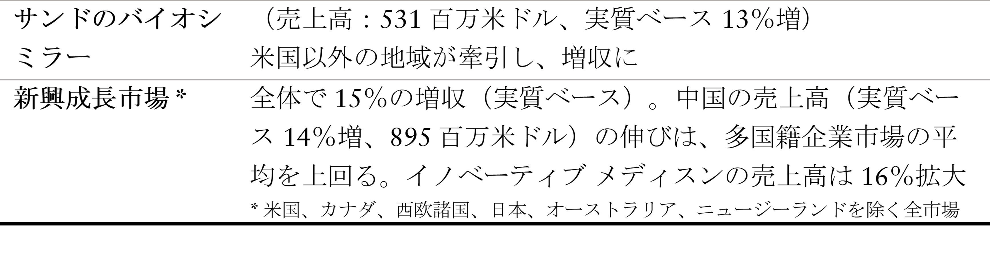 サンドの売上高は、48億米ドル(4%増、実質ベース 8%増)となりました。販売量による貢献は12ポイントあり、価格によるマイナス影響は4ポイントでした。売上高の伸びは、前年の製品上市に伴う販売量の大幅な伸び、咳・風邪の流行、バイオシミラー事業の好調が寄与し、27億米ドル(11%増、実質ベース 14%増)の売上高を記録した欧州が主に牽引しました。バイオ医薬品の全世界での売上高は、米国以外の地域での伸びに牽引され、10億米ドル(12%増、実質ベース 15%増)に増加しました。