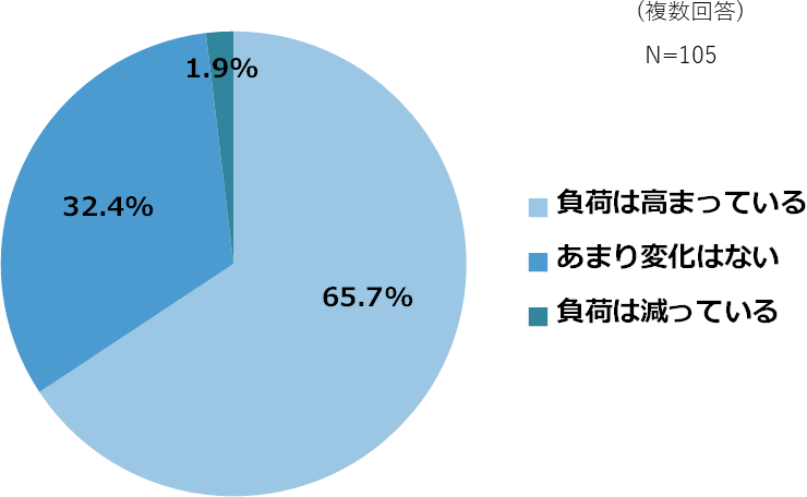 ここ2~3年のマーケティング業務について、「負荷は高まっている」の回答が65.7%と3分の2を占める結果となりました。マーケティング実務者への負担が増えていることがうかがえます。