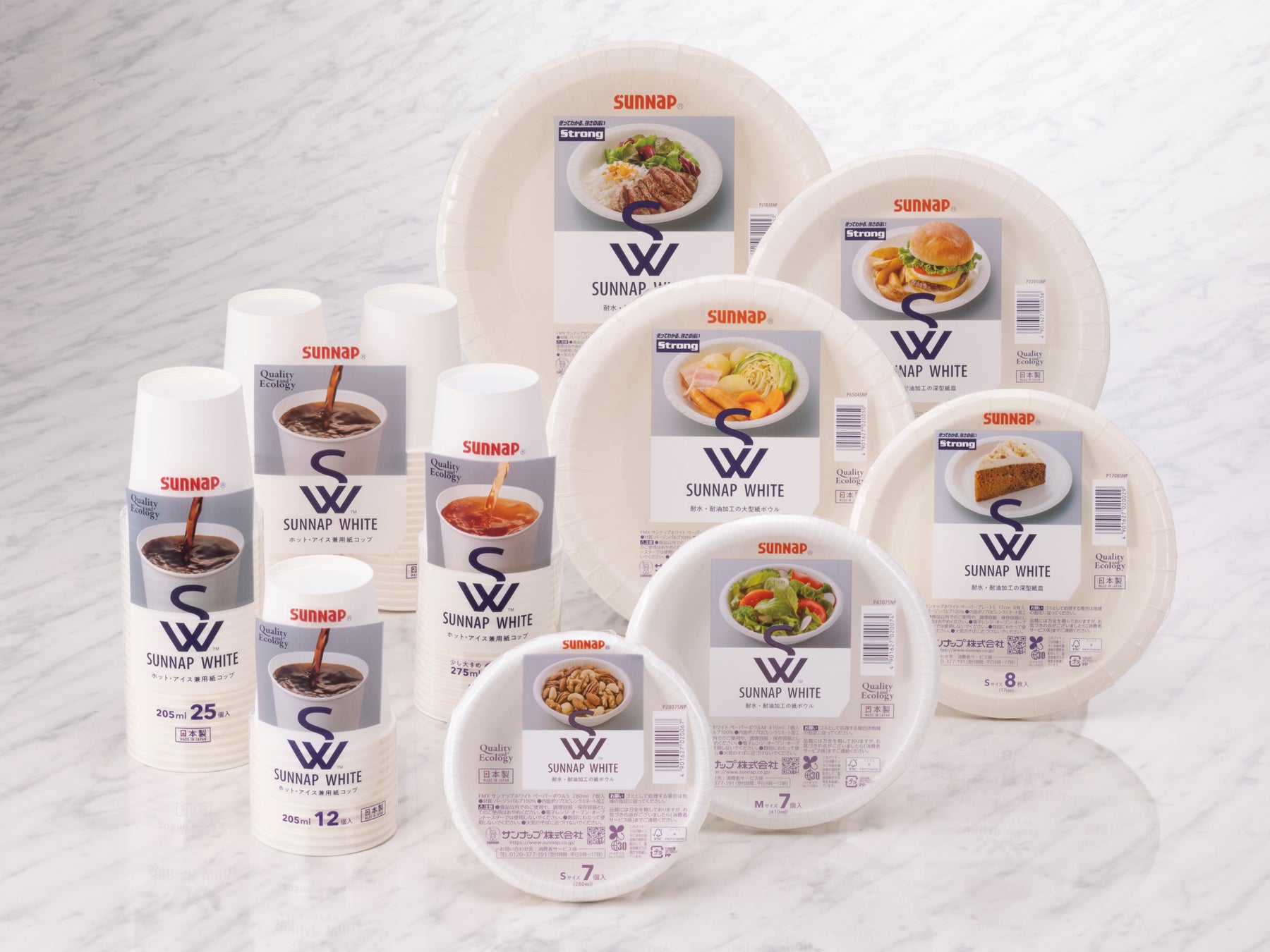 「SUNNAP WHITE」は、サンナップで長年愛され続けた基幹ブランド「WHITE EXTRA(ホワイトエクストラ)」を展開する中で、さらにお客様の期待に沿える製品を検討し、外部に製造委託していた紙皿事業をグループで内製化する新規事業の立ち上げをきっかけとして誕生しました。高い強度を持ちつつも環境に配慮した時代のニーズに応える新基幹ブランドです。