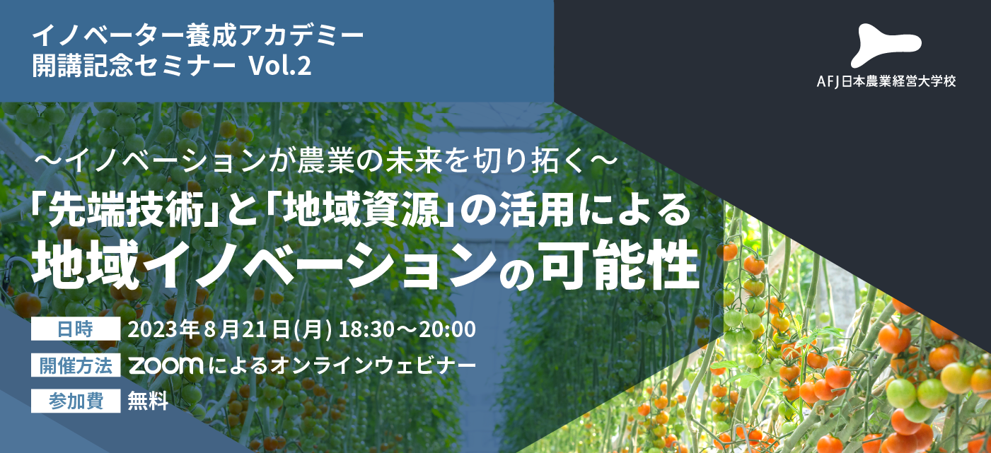 本セミナーは、イノベーター養成アカデミーを修了した先にある将来像(目指す人材)である『アグリビジネスイノベーター』(※2)として現在活躍されている方やイノベーション・新規事業支援を専門とされている方にご登壇いただき、アグリビジネス領域の動向や可能性、イノベーションに繋がる着想などについてお話しいただくものです。