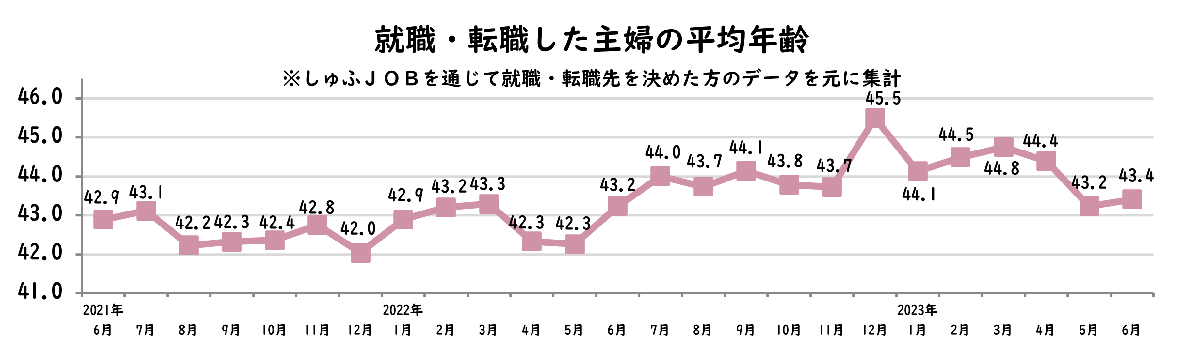 【傾向】転職主婦の平均年齢は、前月比+0.2歳、前年同月比+0.2歳の43.4歳。