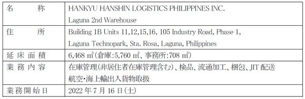 当社フィリピン現地法人であるHANKYU HANSHIN LOGISTICS PHILIPPINES INC.は、首都マニラ近郊ラグナ州の工業団地「ラグナテクノパーク」内にあるラグナ本社倉庫に隣接する「ラグナ第二倉庫」を開設し、7月16日より営業を開始します。