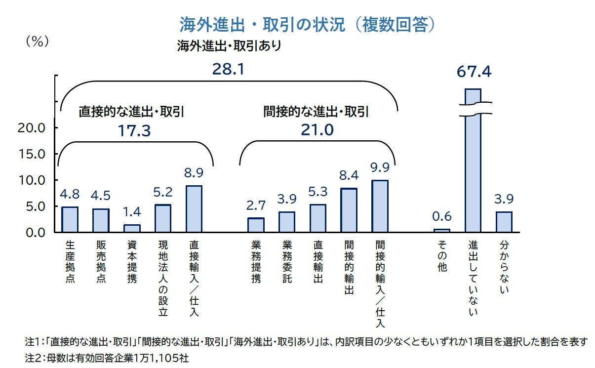 「直接・間接のいずれかの形で海外進出・取引をしている」企業(28.1%)はおよそ3割となる一方で、「進出していない」企業は67.4%だった。