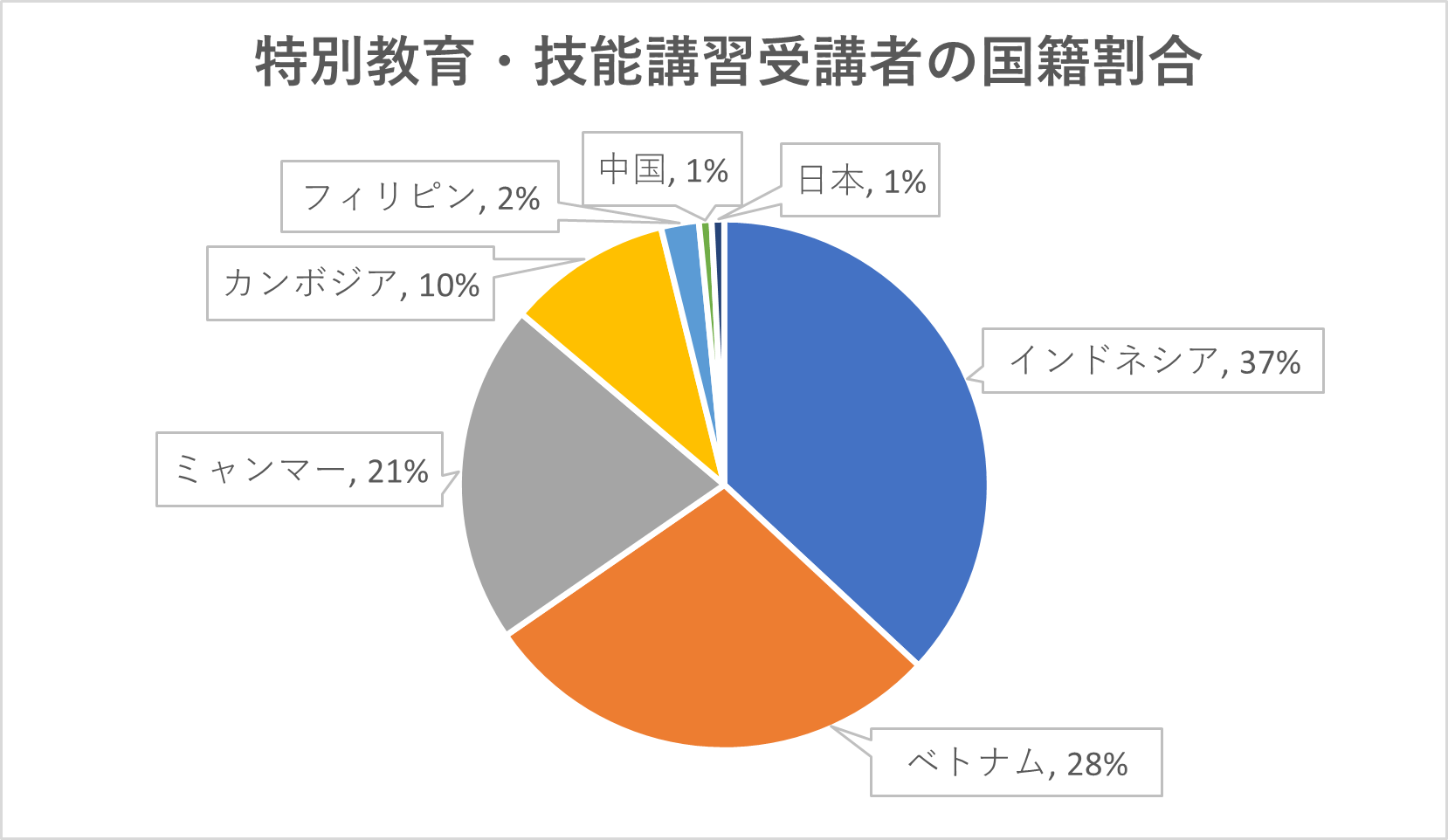 関東研修センターで特別教育・技能講習を受講した人数は約170名です。そして、関東研修センターで受講した国籍の割合を見るとインドネシアが最も多く、約4割を占めています。