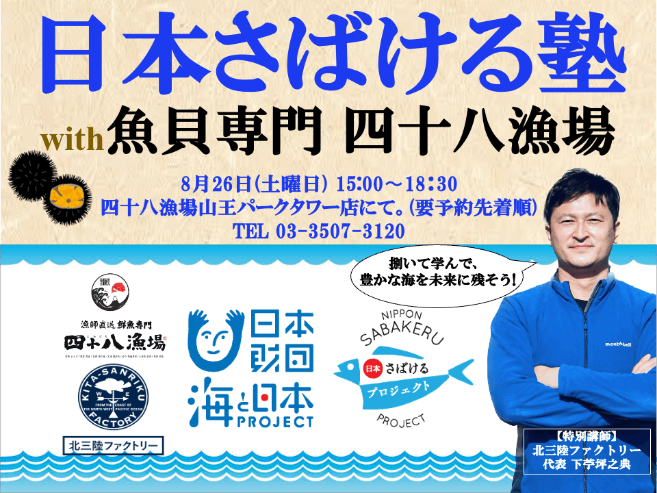 鮮魚居酒屋「魚貝専門 漁師直結 四十八漁場」で開催する「日本さばける塾 with 魚貝専門 四十八漁場」では、「北三陸から、世界の海を豊かにする。」をミッションに、岩手県北三陸で水産のトレーサビリティやウニの畜養に取り組む株式会社北三陸ファクトリー代表取締役CEOの下苧坪 之典(したうつぼ ゆきのり)さんを招聘。北三陸産の魚さばきを通じて、北三陸で起こる海洋環境変化を学べるイベントになります。