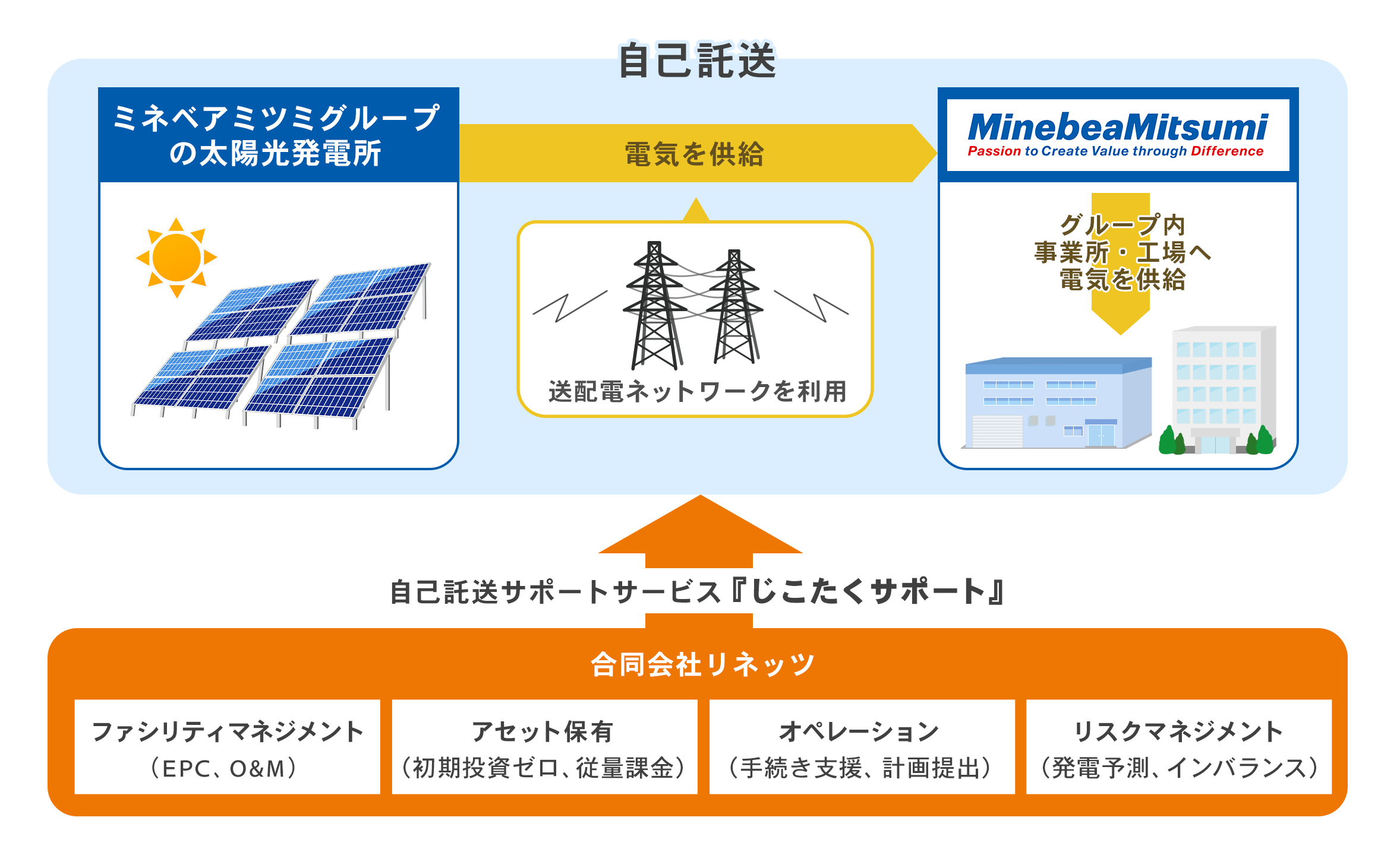 三菱HCキャピタル株式会社および中央電力株式会社は、このたび、両社の共同出資により設立した合同会社リネッツを通じて、ミネベアミツミ株式会社とミツミ電機株式会社(以下、ミネベアミツミグループ)に「じこたくサポートサービス(以下、じこたくサポート)」の提供を開始しました。2023年6月から7月にかけて、ミネベアミツミグループの関東エリア5カ所の事業所および工場にNon-FIT(非FIT*1)の追加性*2の高い低圧太陽光発電による電力の供給を開始、ミネベアミツミグループのCO2削減に貢献します。