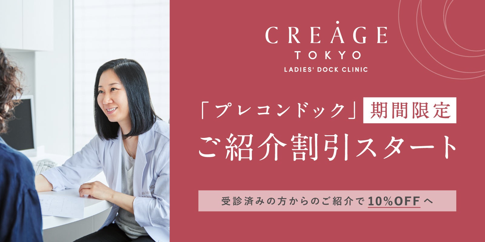 ・キャンペーン内容:クレアージュ東京 レディースドッククリニックにて人間ドック・健康診断をご受診いただいた方(個人受診・会社経由受診問わず)からのご紹介により、「プレコンドック」「プレコンドックプレミアム」を通常価格より10%オフでご提供いたします。